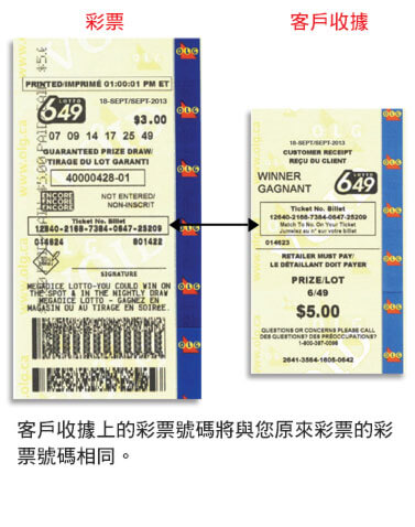 - 無論您的彩票是否中奬,零售商必須將所有LOTTO及INSTANT彩票,連同相關的客戶收據(Customer Receipts)交還給您。